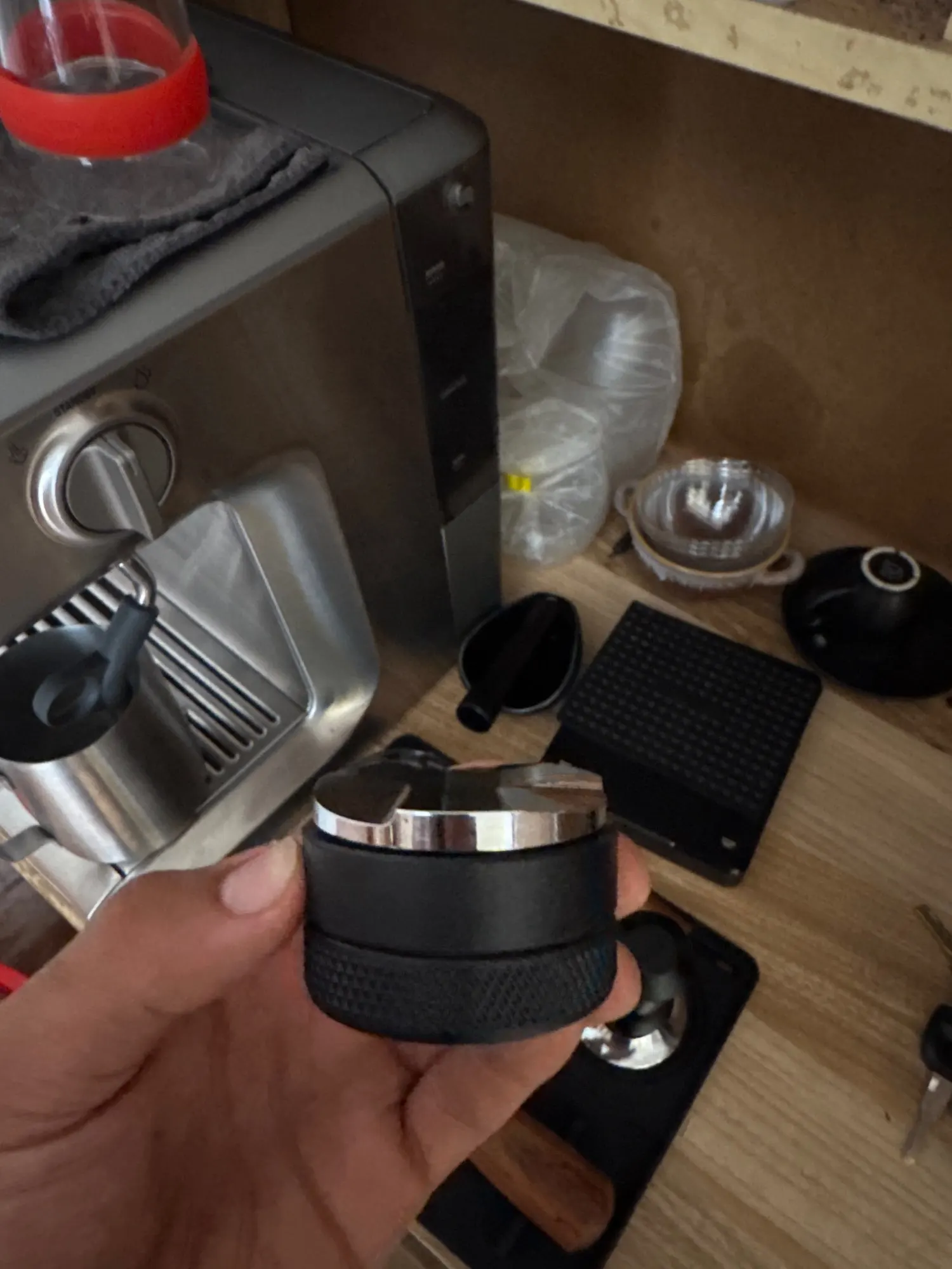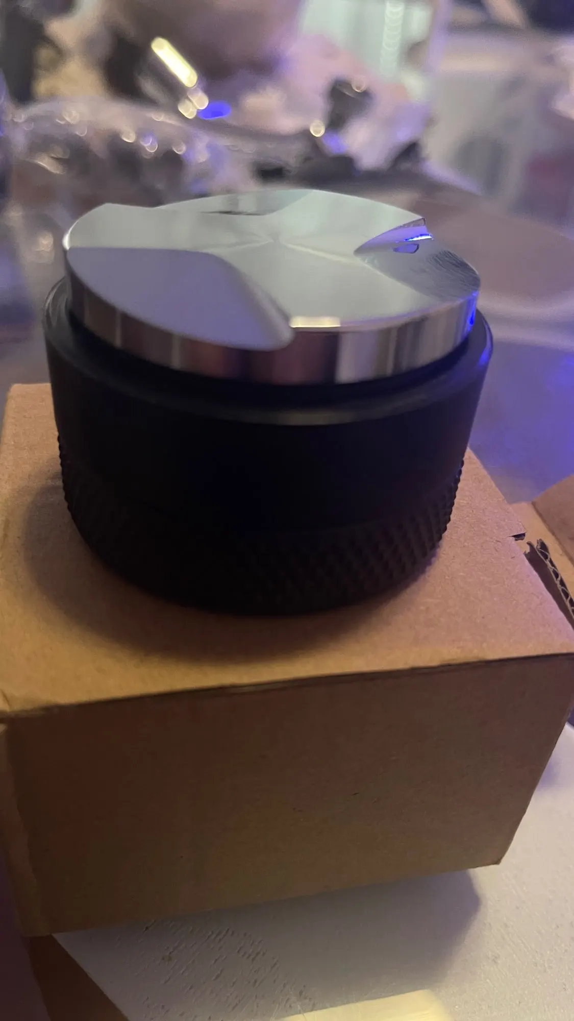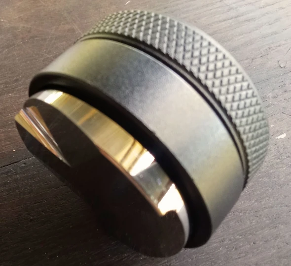 Son corps métallique texturé offre une excellente prise en main et résiste très bien à l’usage répété. Le dessus plat permet aussi de le poser proprement sur une station ou un support d’accessoires espresso.