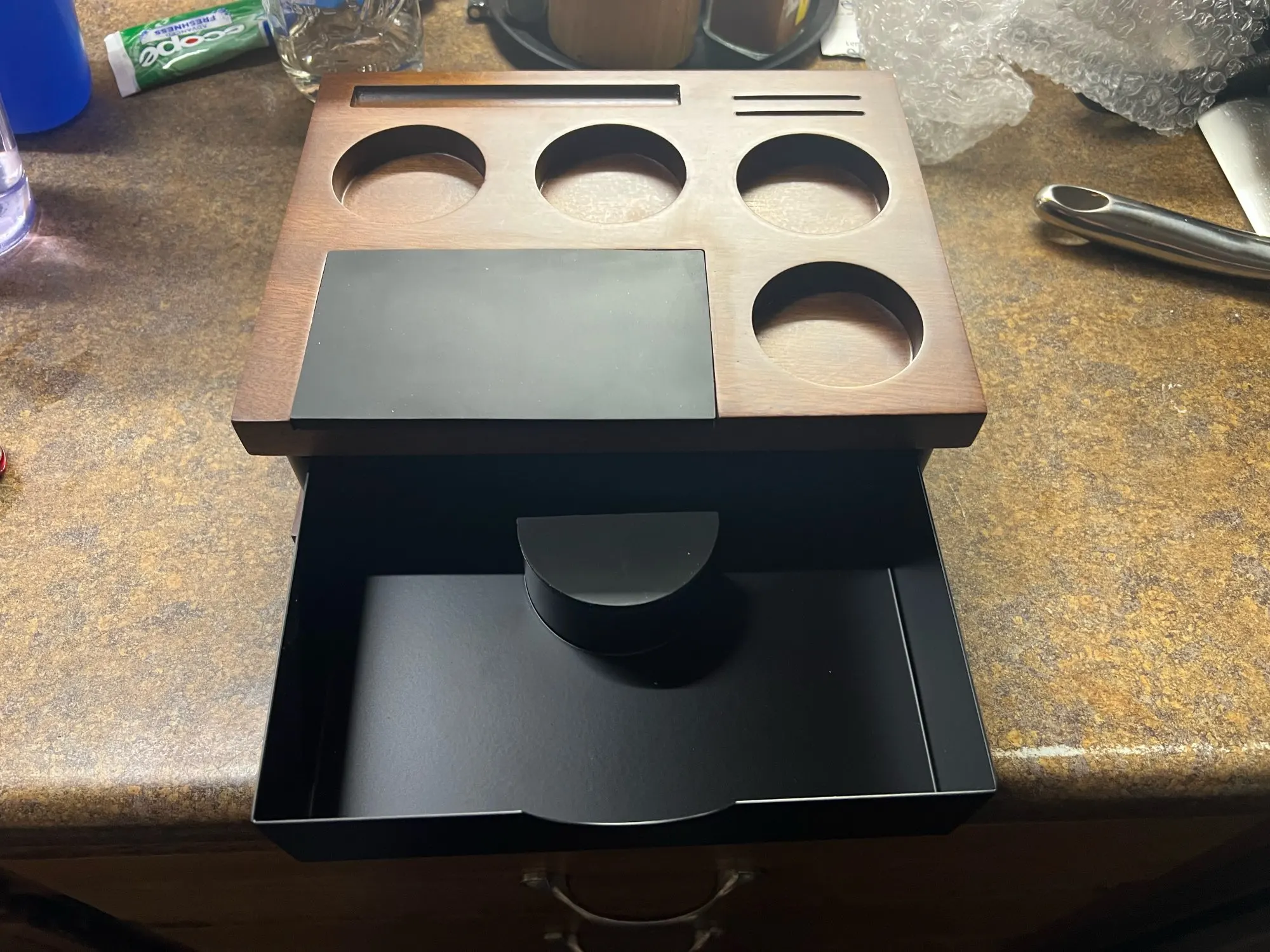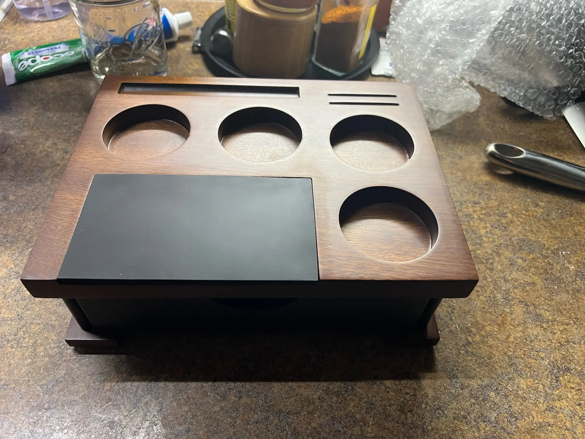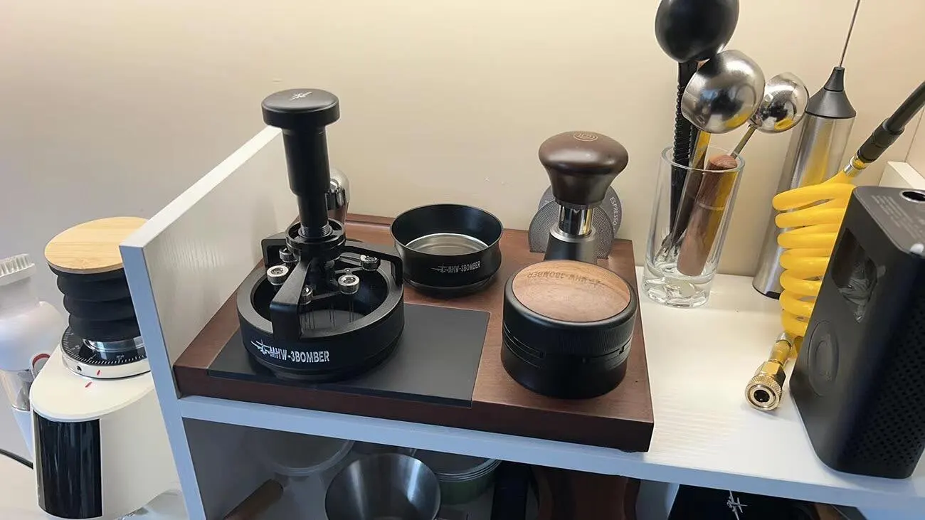 – Station compacte (1 niveau) : plateau élégant et peu encombrant, idéal si tu as un espace réduit mais que tu veux organiser clairement tamper, porte-filtre et accessoires.