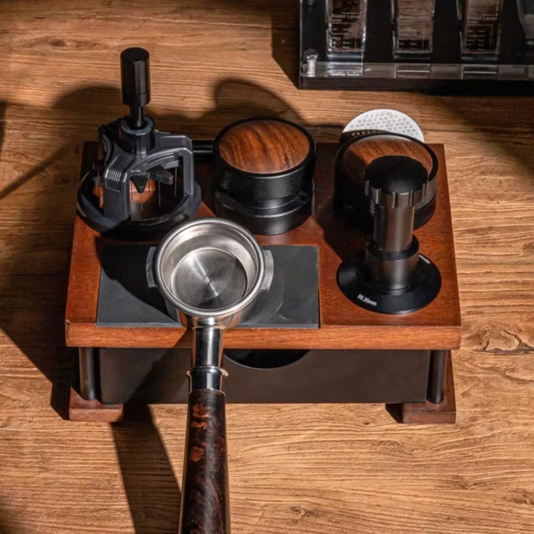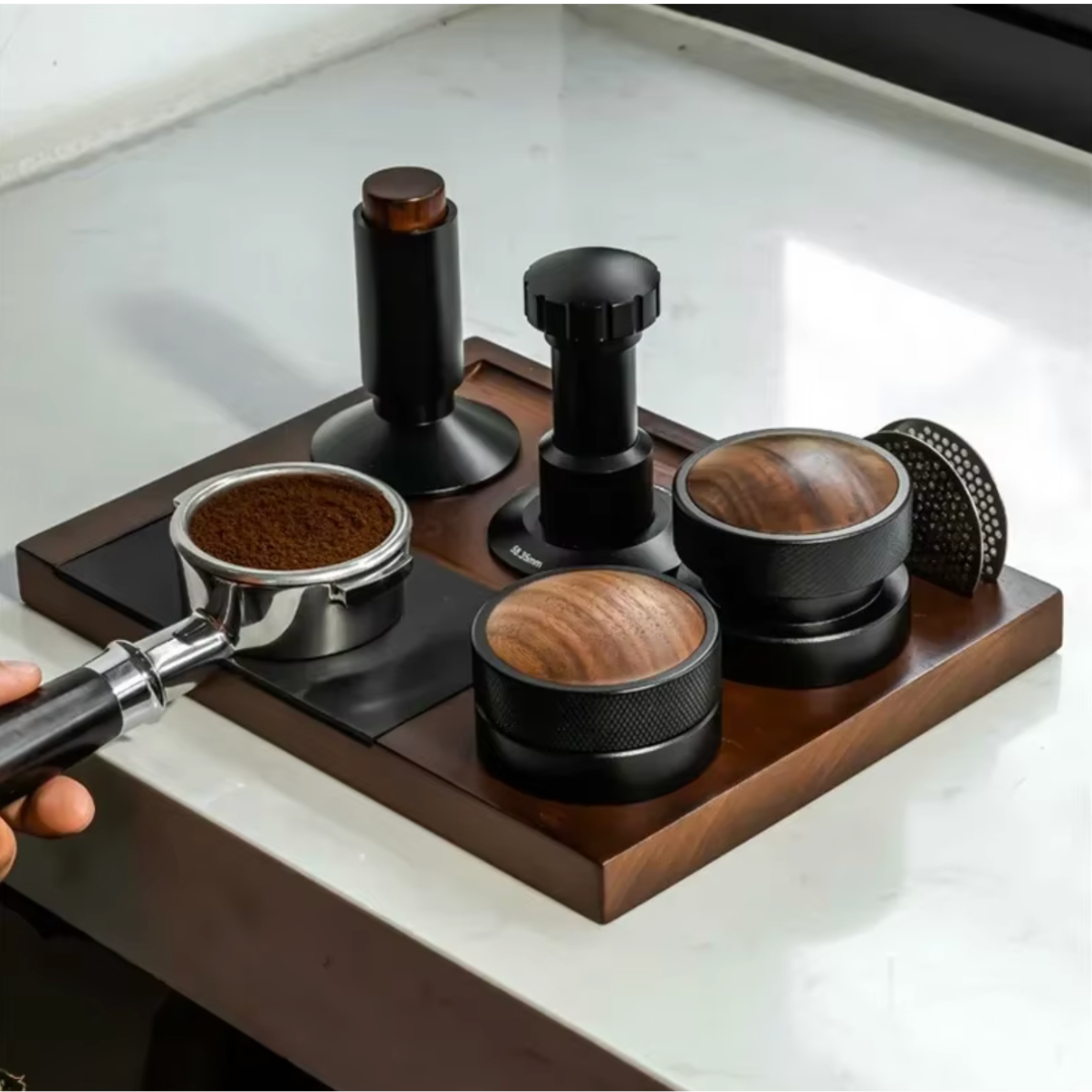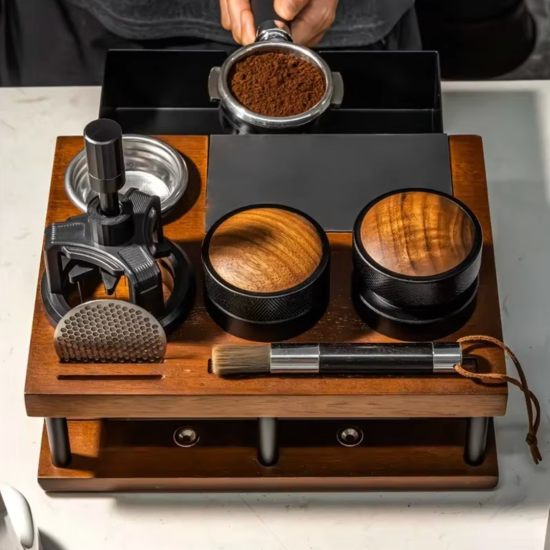 Cette station de tassage espresso rassemble au même endroit ton porte-filtre, ton tamper, ton distributeur et tes principaux accessoires. Sa conception universelle 51–58 mm la rend compatible avec la plupart des outils barista du marché, tout en apportant une vraie cohérence visuelle à ton coin café.
