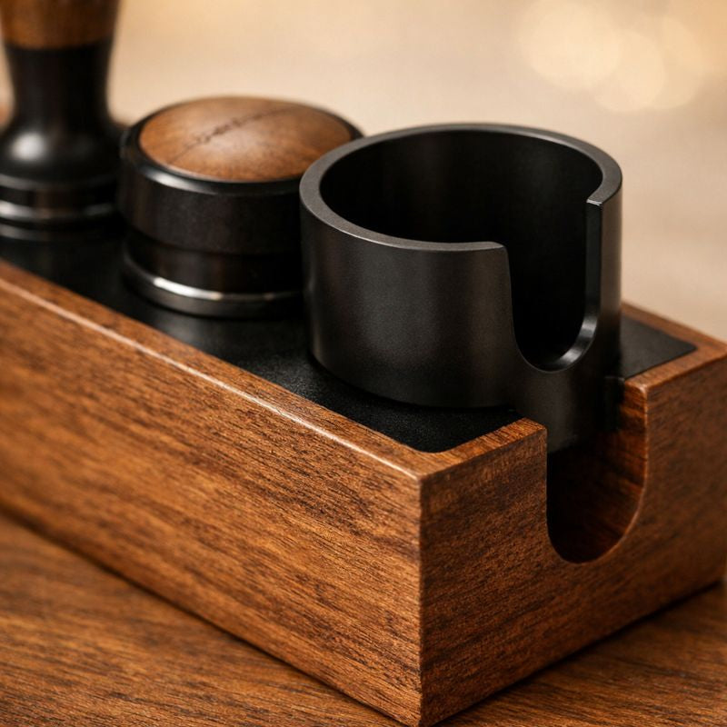 Avec le support porte-filtre à 90°, ton tassage devient plus stable et plus constant. Et comme tout est rangé (tamper, distributeur, filtres), tu gagnes du temps et tu gardes un coin barista propre et premium — shot après shot.