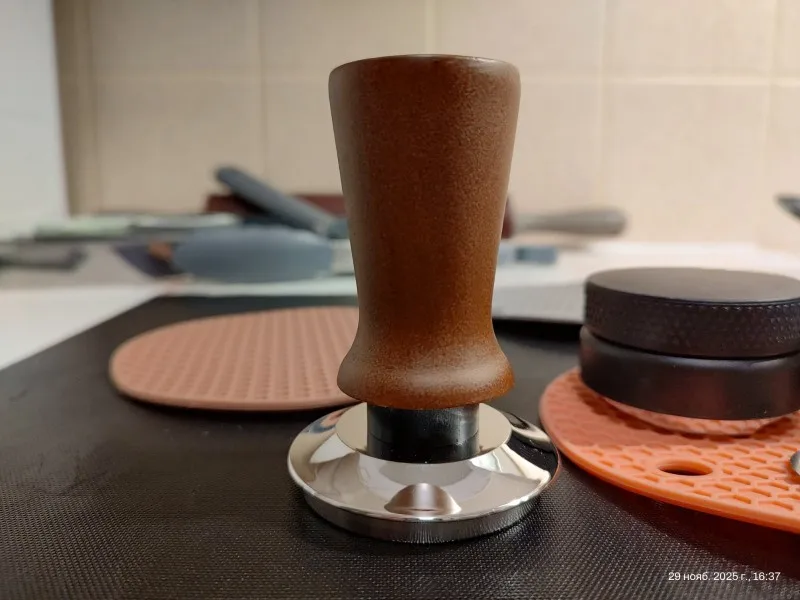 La base du tamper est fabriquée en acier inoxydable 304 de qualité alimentaire, résistant à la corrosion et simple à entretenir. La surface plane assure un contact uniforme avec le café moulu pour un tassage régulier.